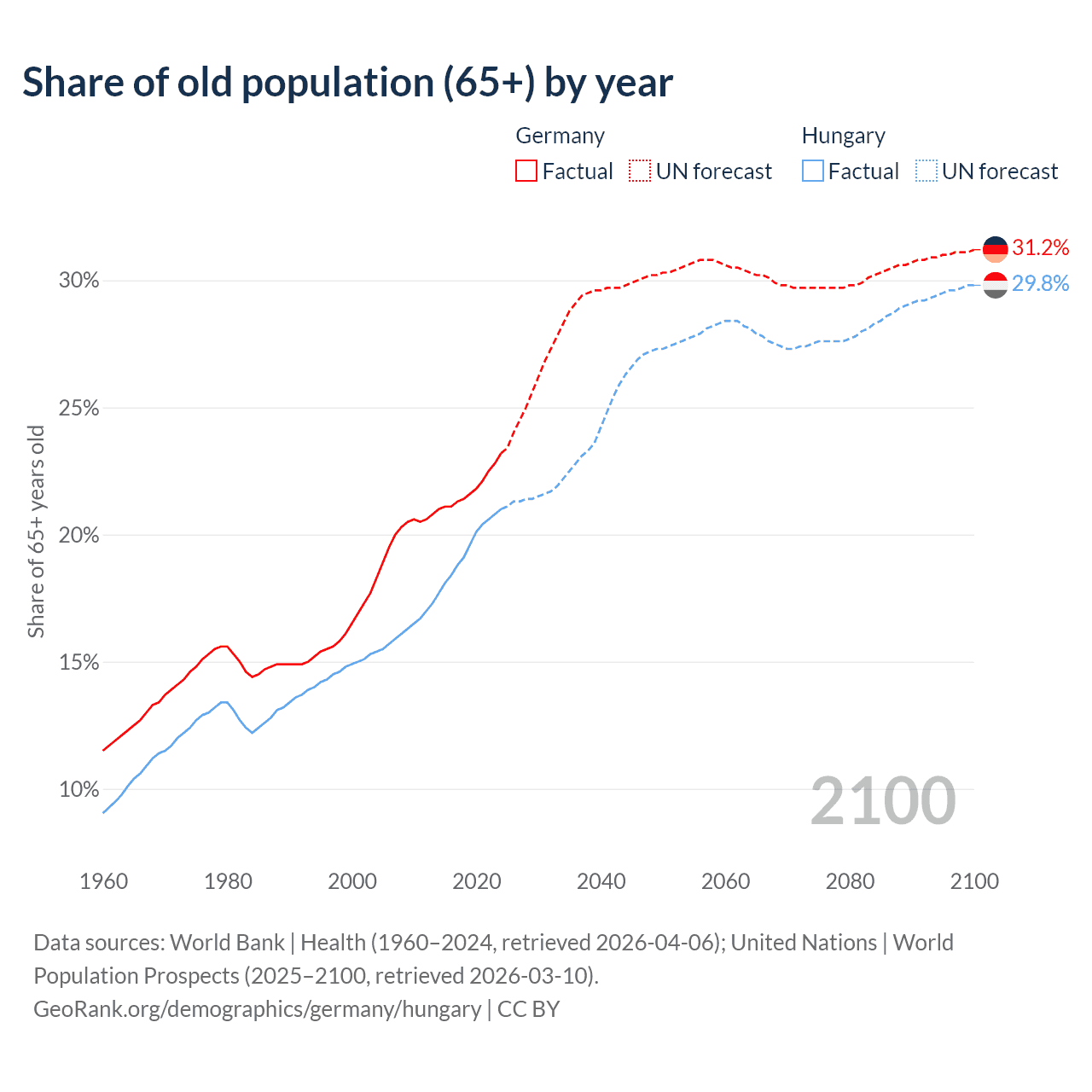 The share of older people aged 65 and over is 23.2% in Germany and 21% in Hungary. Life expectancy in Germany compared to Hungary .