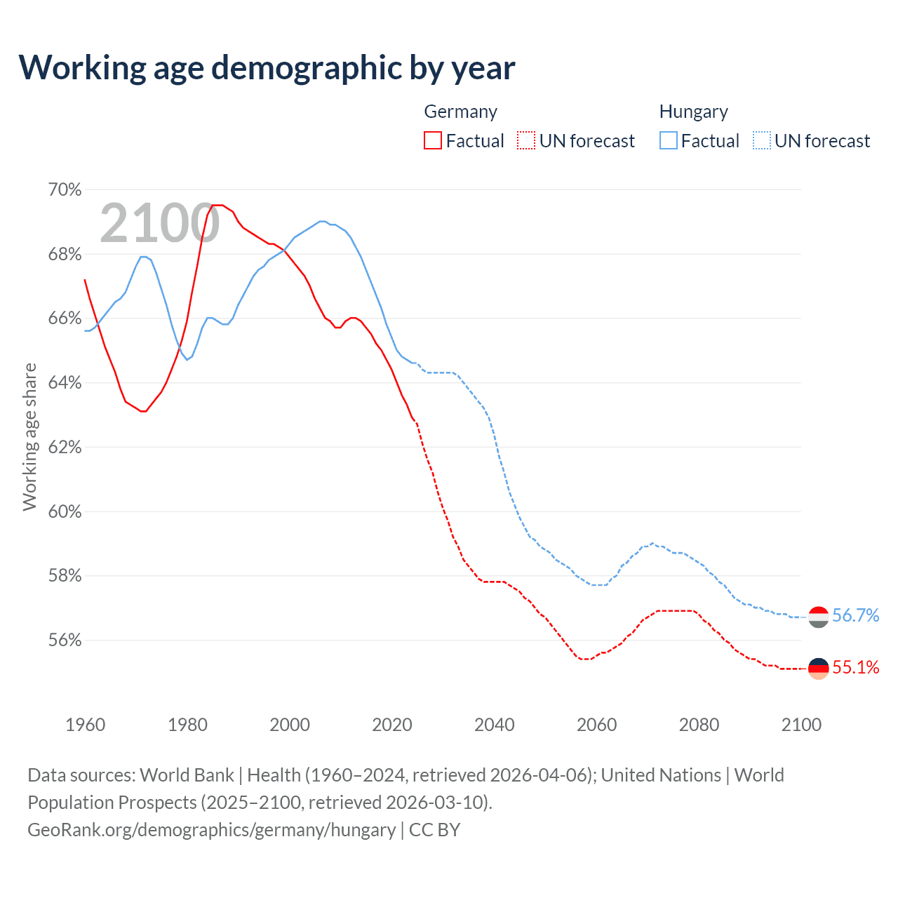 - Germany has 51.9M working age adults (aged 15-64) vs 6.12M in Hungary.