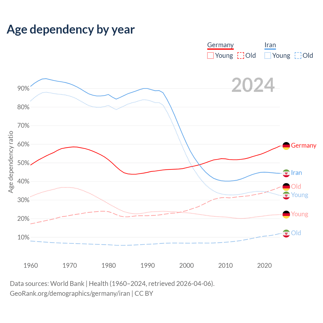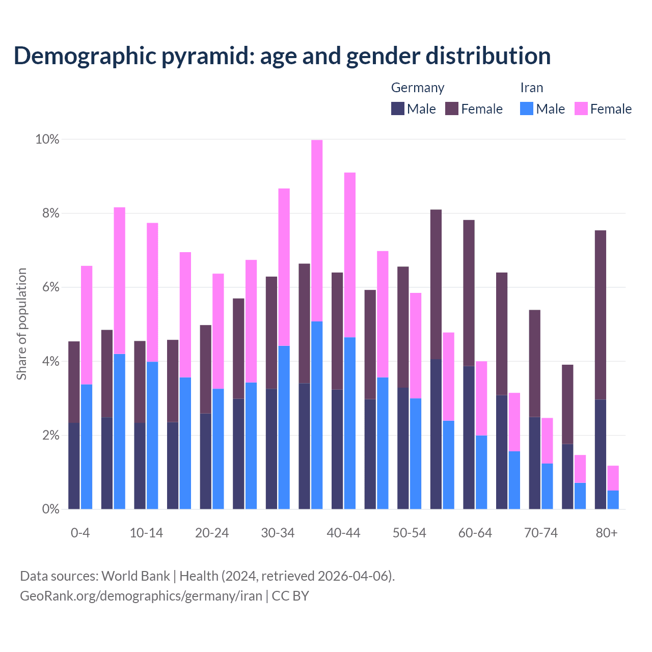 - Germany is ranked 9/196 by median age (oldest to youngest) vs 79/196 for Iran.