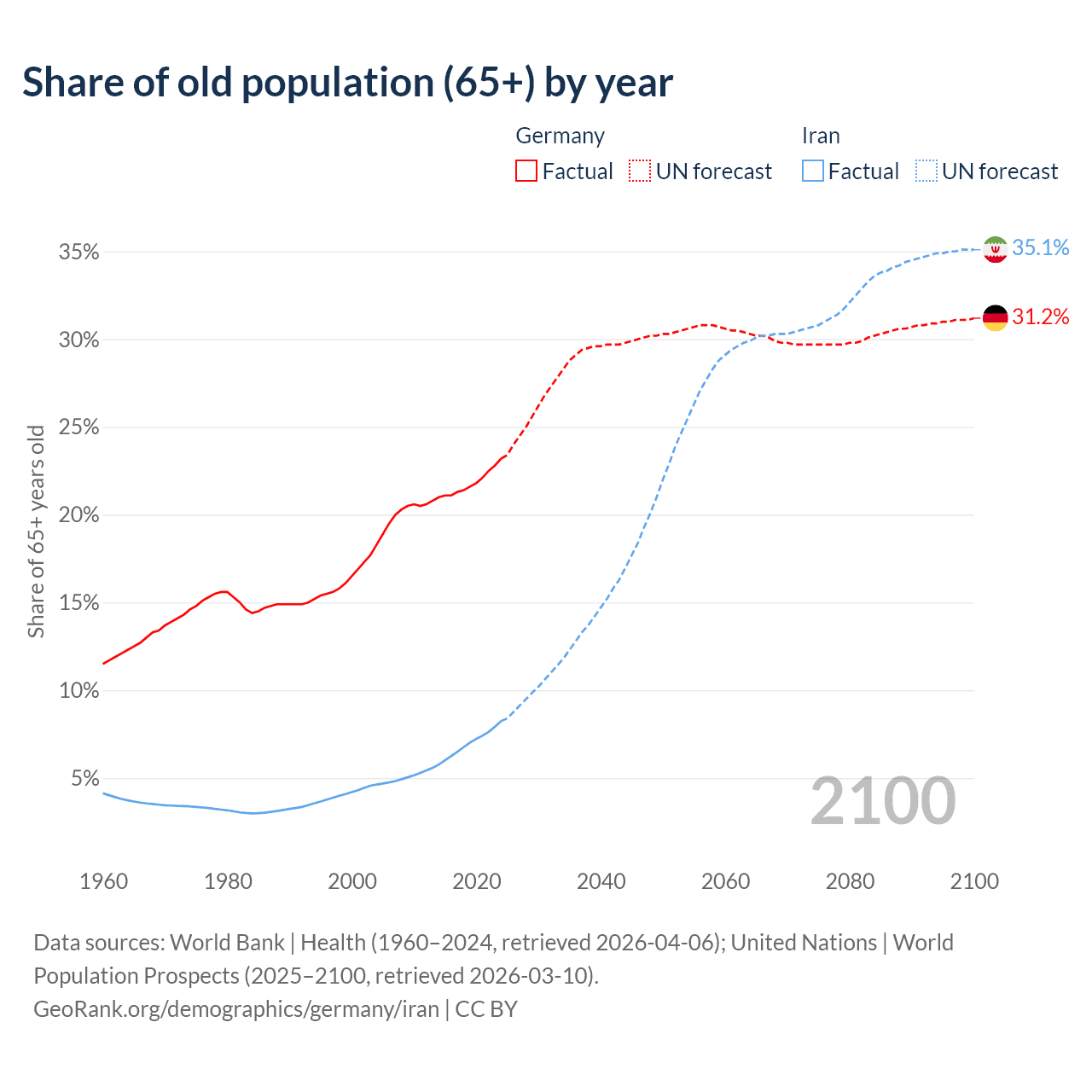 - The share of old-age demographic (65+) in Germany is 23.2% vs 8.24% in Iran.