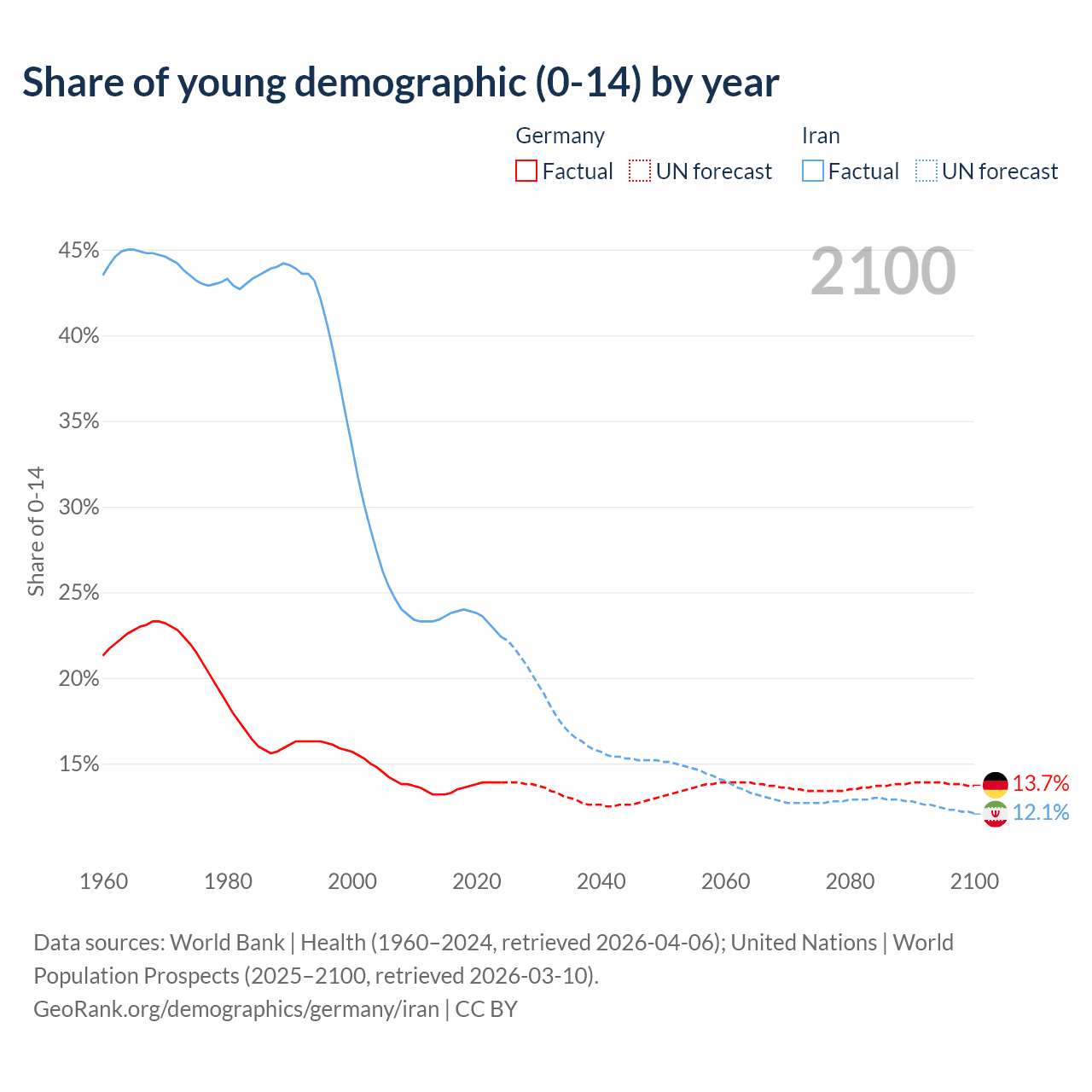 - The share of young demographic (0-15 years old) in Germany is 13.9% vs 22.4% in Iran.