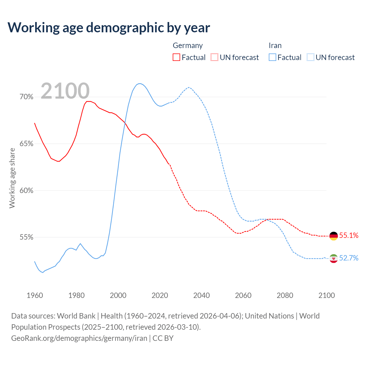 - Germany has 51.9M working age adults (aged 15-64) vs 64.8M in Iran.