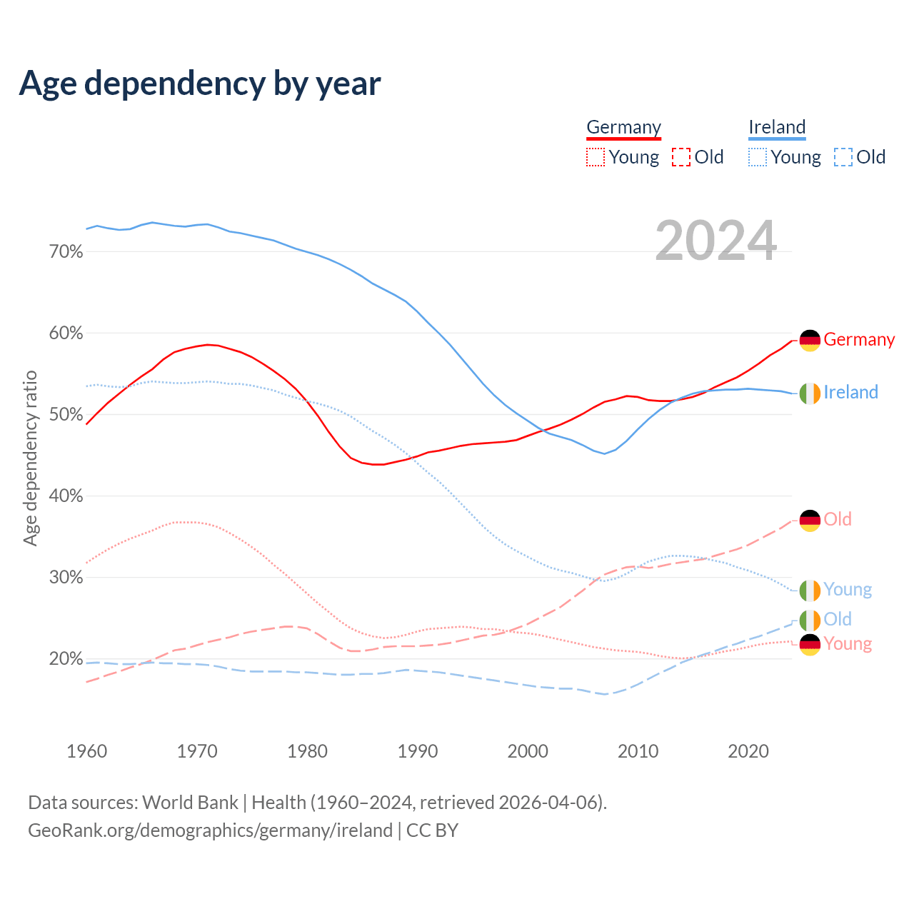 - Germany is ranked 9/196 by median age (oldest to youngest) vs 48/196 for Ireland.