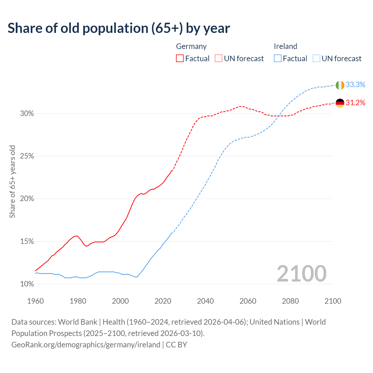 The share of older people aged 65 and over is 23.2% in Germany and 15.9% in Ireland. Life expectancy in Germany compared to Ireland .
