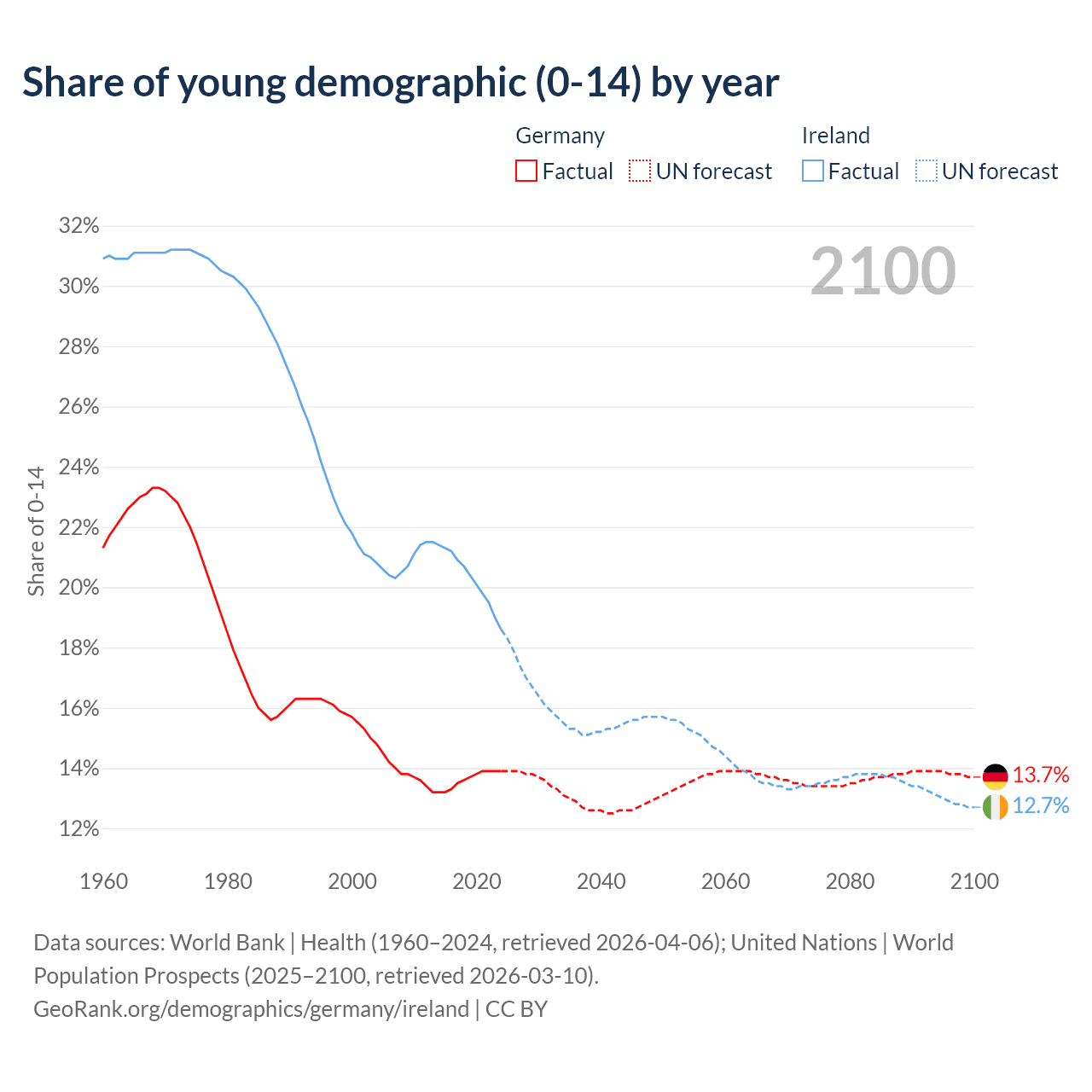 - The share of young demographic (0-15 years old) in Germany is 13.9% vs 18.6% in Ireland.