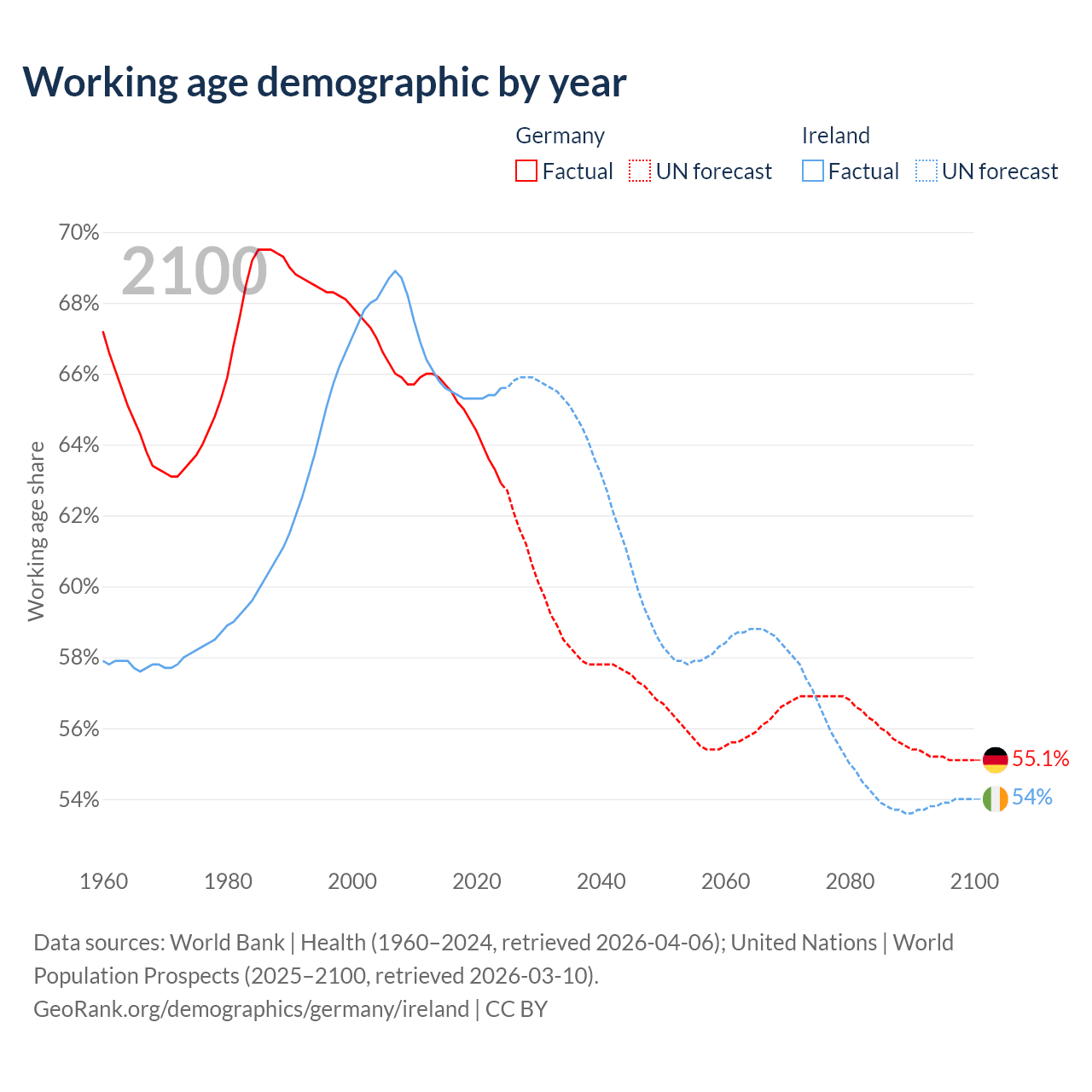 Median age Germany vs Ireland, 1960-2100