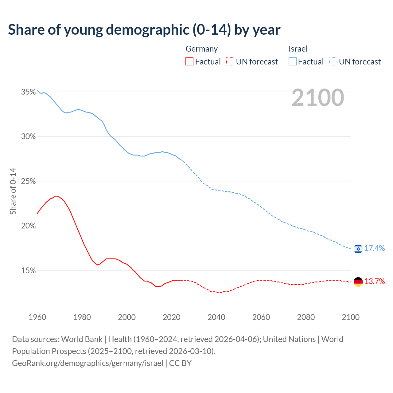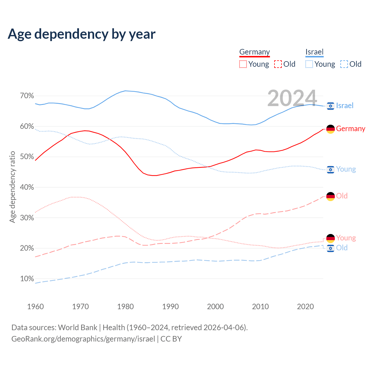 - Germany is ranked 9/196 by median age (oldest to youngest) vs 103/196 for Israel.