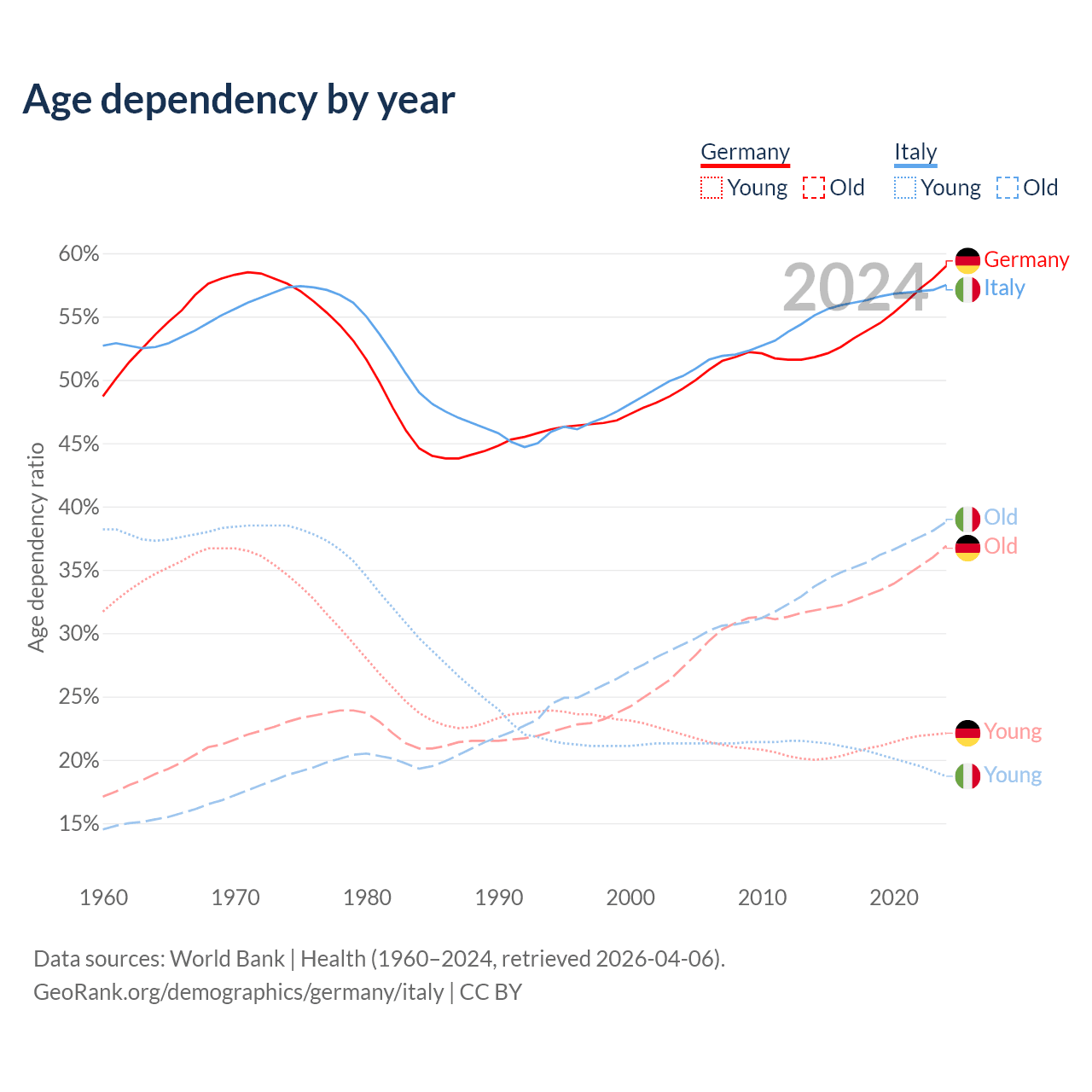 - Germany is ranked 9/196 by median age (oldest to youngest) vs 4/196 for Italy.