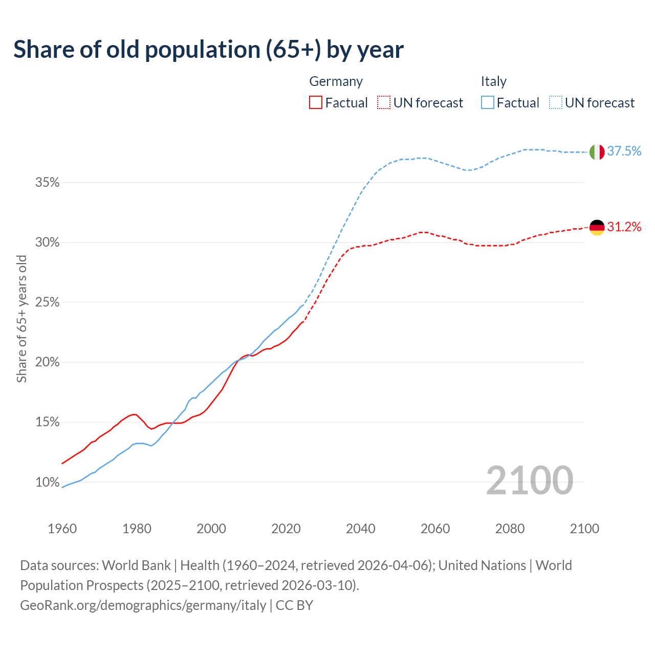 The share of older people aged 65 and over is 23.2% in Germany and 24.6% in Italy. Life expectancy in Germany compared to Italy .
