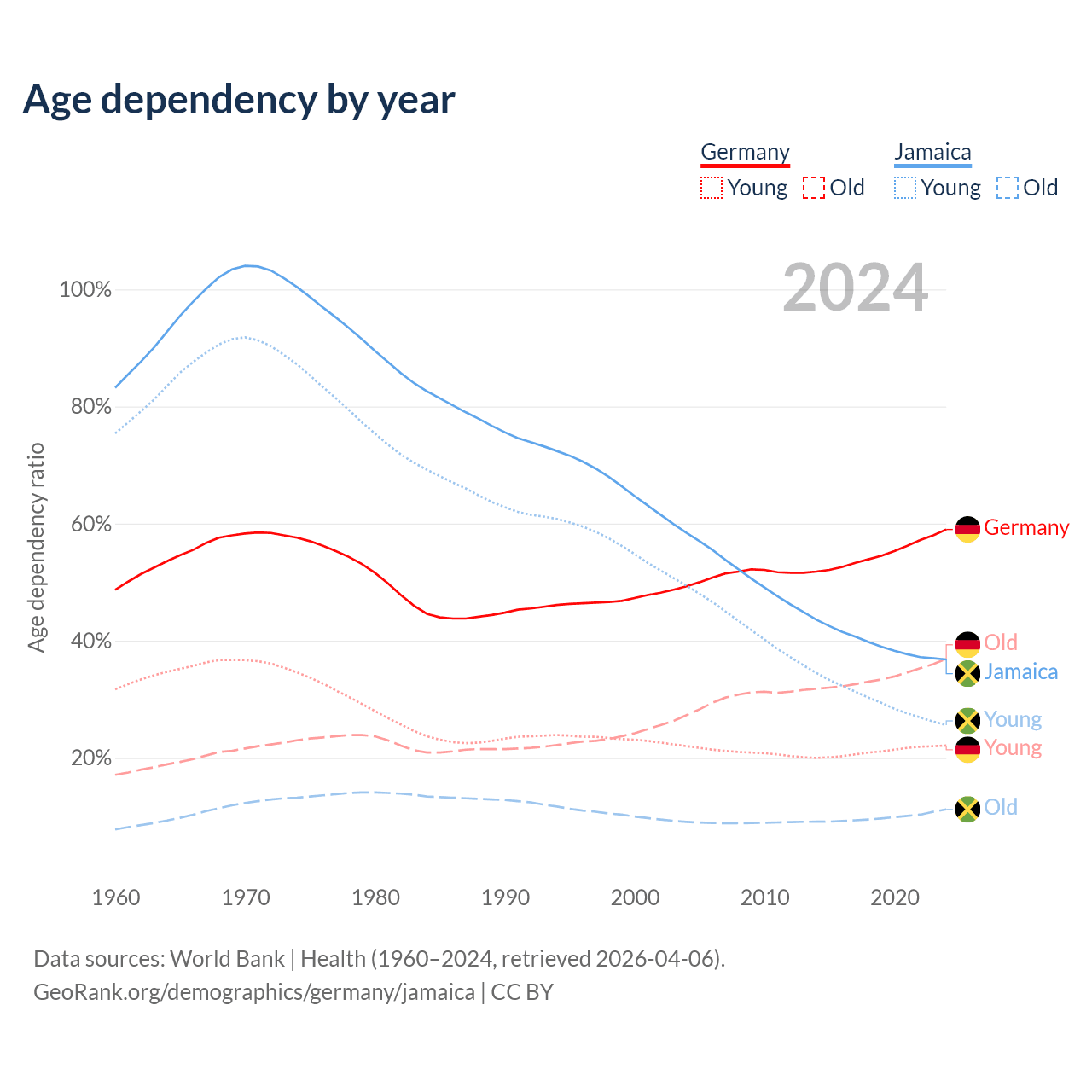 - Germany is ranked 9/196 by median age (oldest to youngest) vs 87/196 for Jamaica.