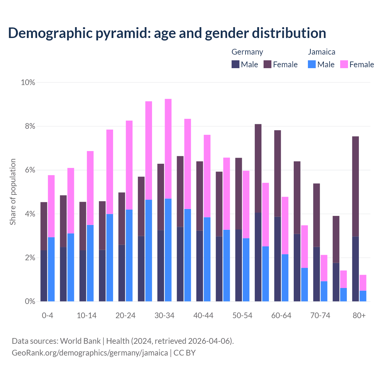 - As of 2026, the population of Germany is 82.6M vs 2.83M in Jamaica - 29.1 times difference.