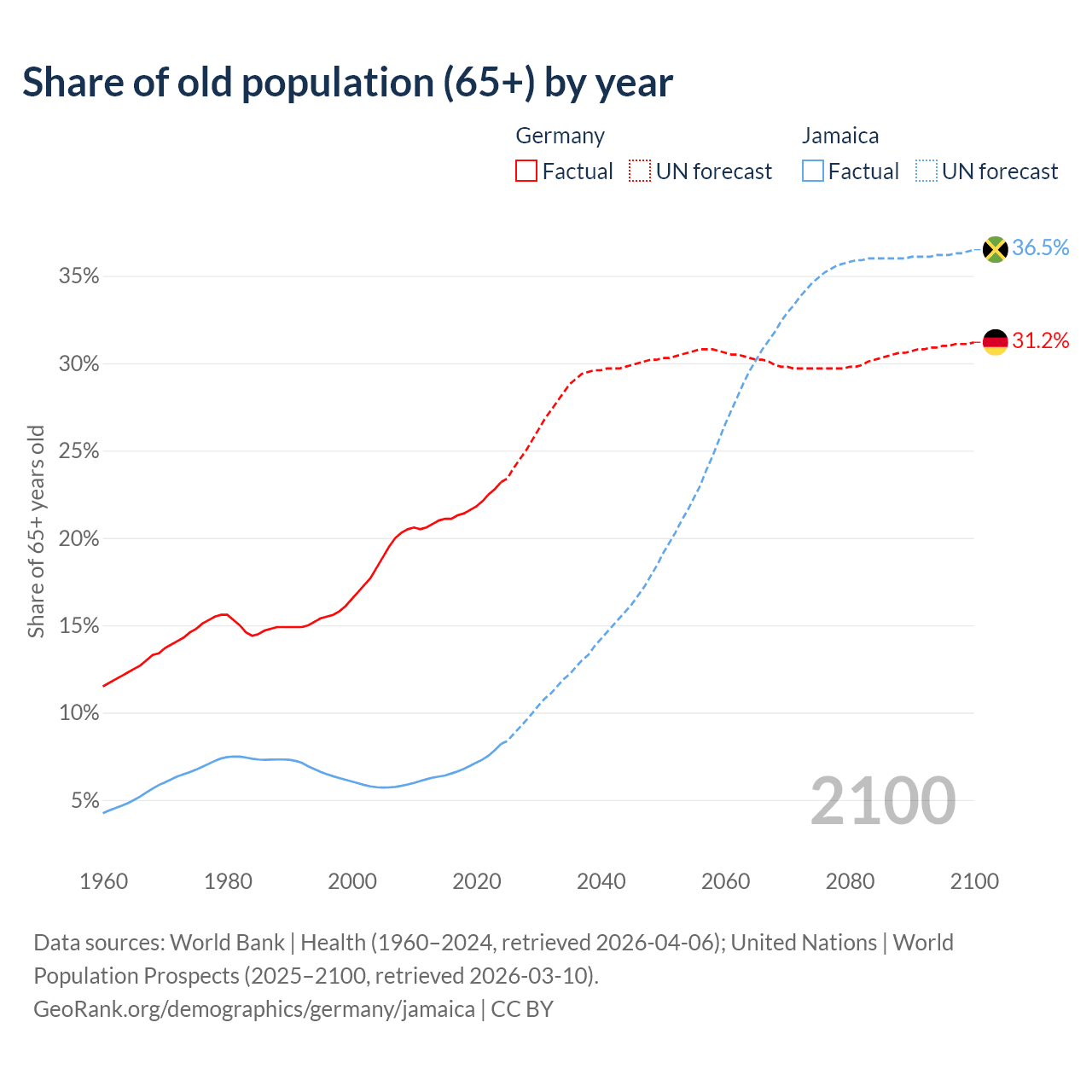 The share of older people aged 65 and over is 23.2% in Germany and 8.21% in Jamaica. Life expectancy in Germany compared to Jamaica .