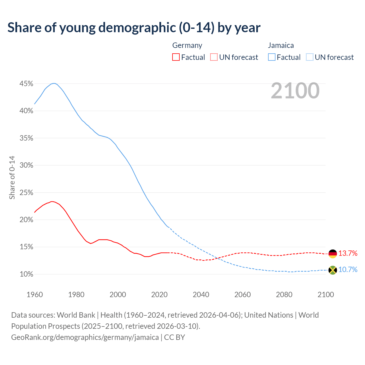 - The share of young demographic (0-15 years old) in Germany is 13.9% vs 18.7% in Jamaica.