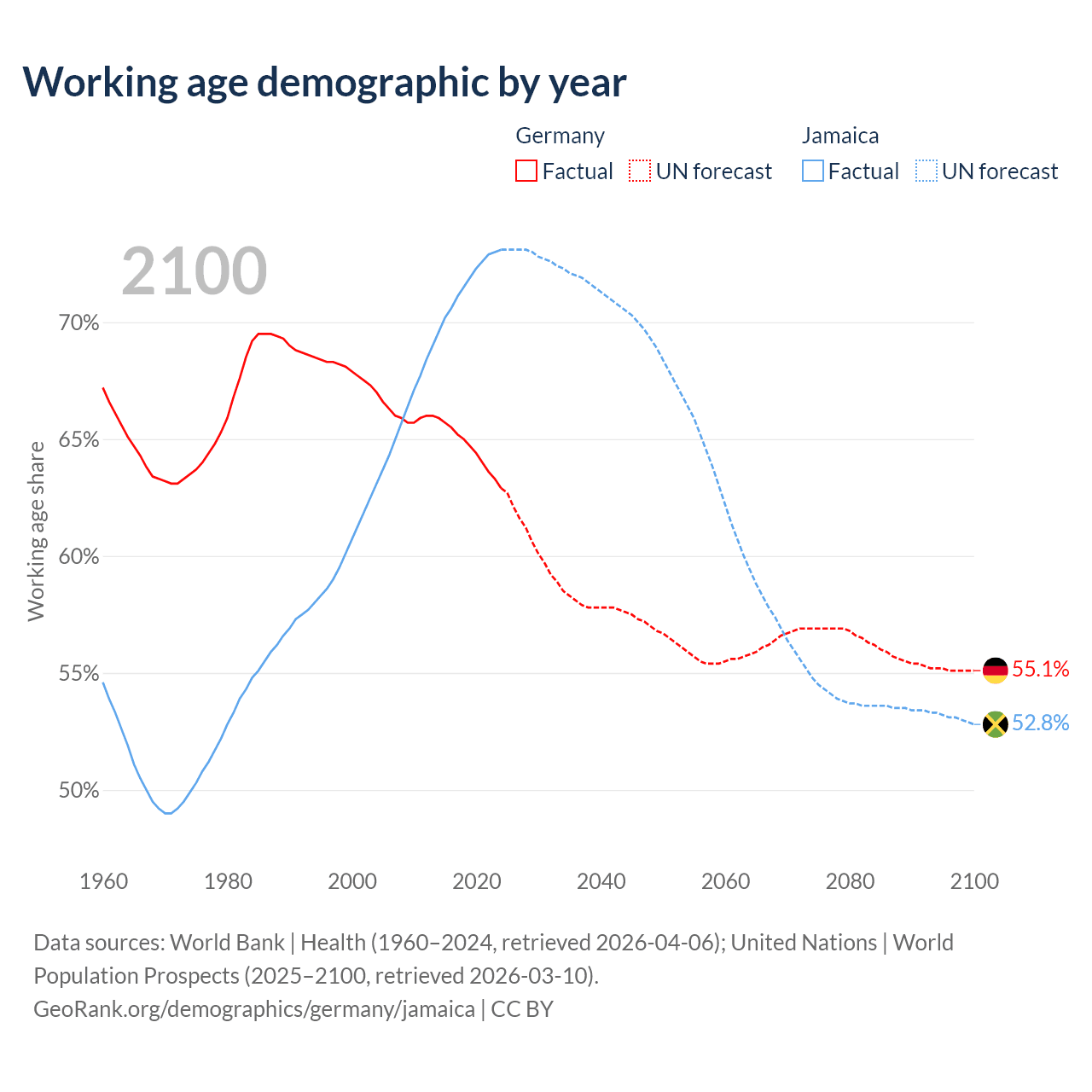 - Germany has 51.9M working age adults (aged 15-64) vs 2.07M in Jamaica.