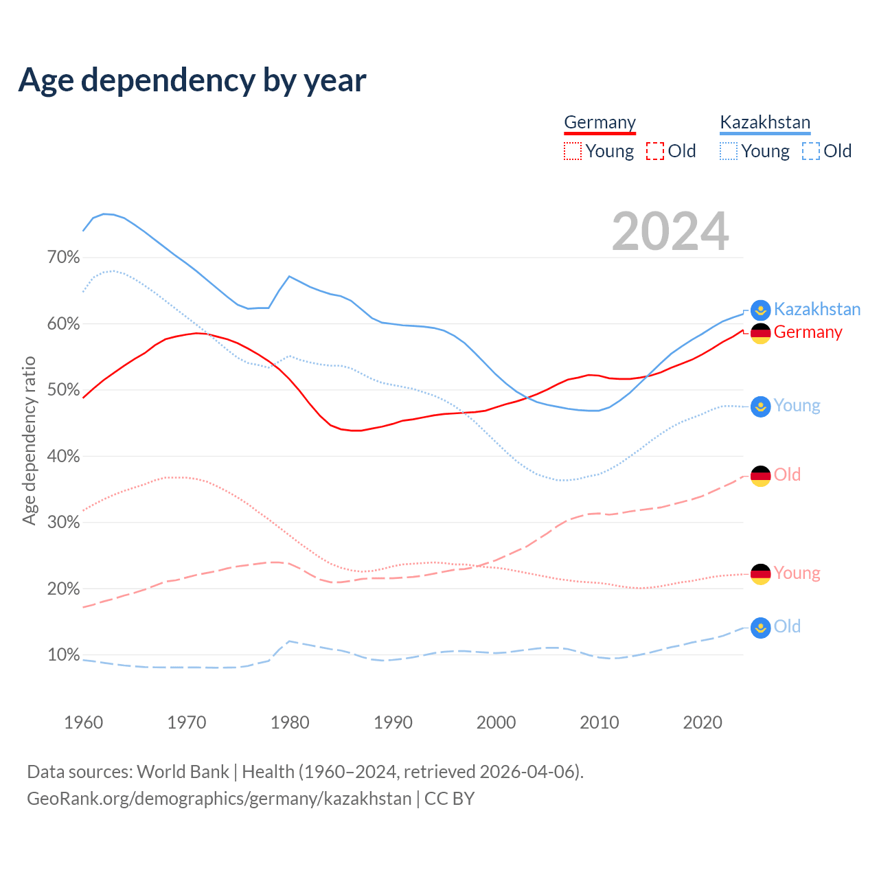 - Germany is ranked 9/196 by median age (oldest to youngest) vs 99/196 for Kazakhstan.