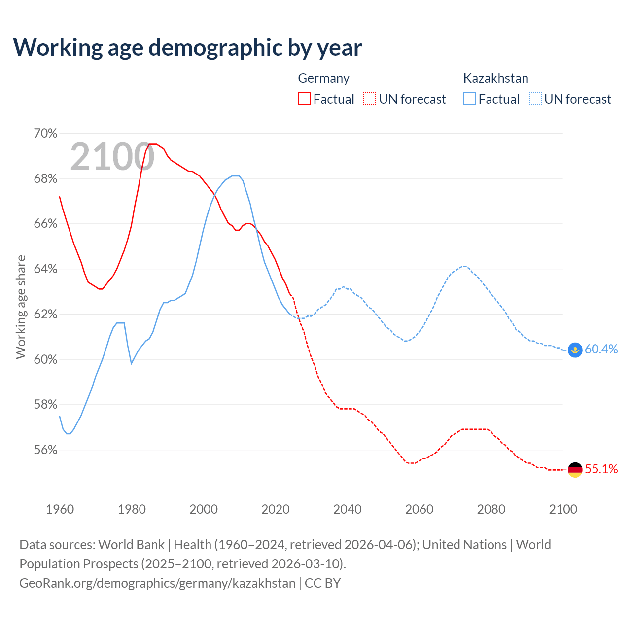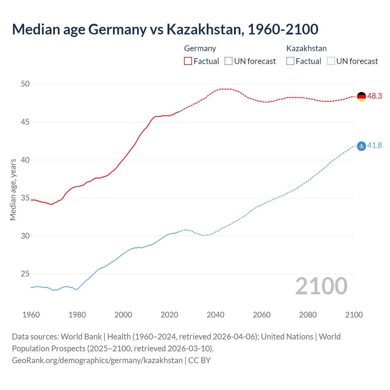 Median age Germany vs Kazakhstan, 1960-2100