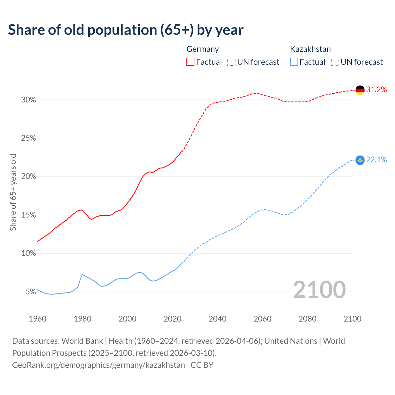 The share of older people aged 65 and over is 23.2% in Germany and 8.65% in Kazakhstan. Life expectancy in Germany compared to Kazakhstan .