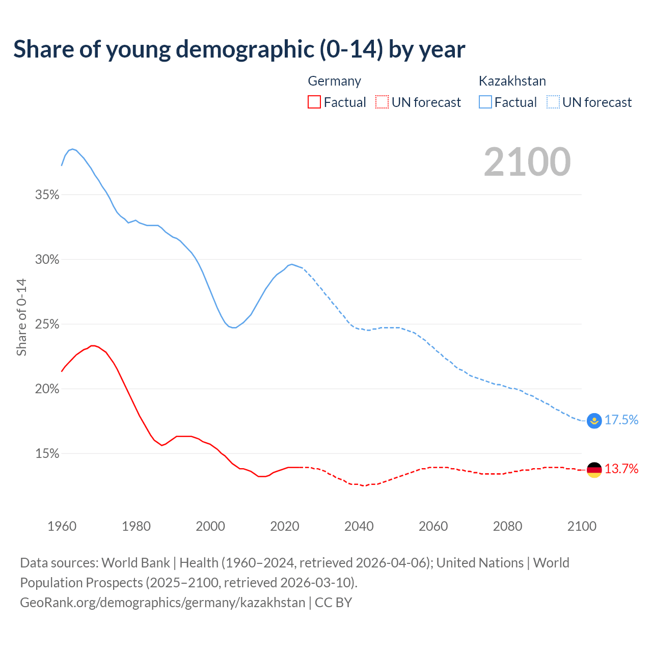 - The share of young demographic (0-15 years old) in Germany is 13.9% vs 29.4% in Kazakhstan.
