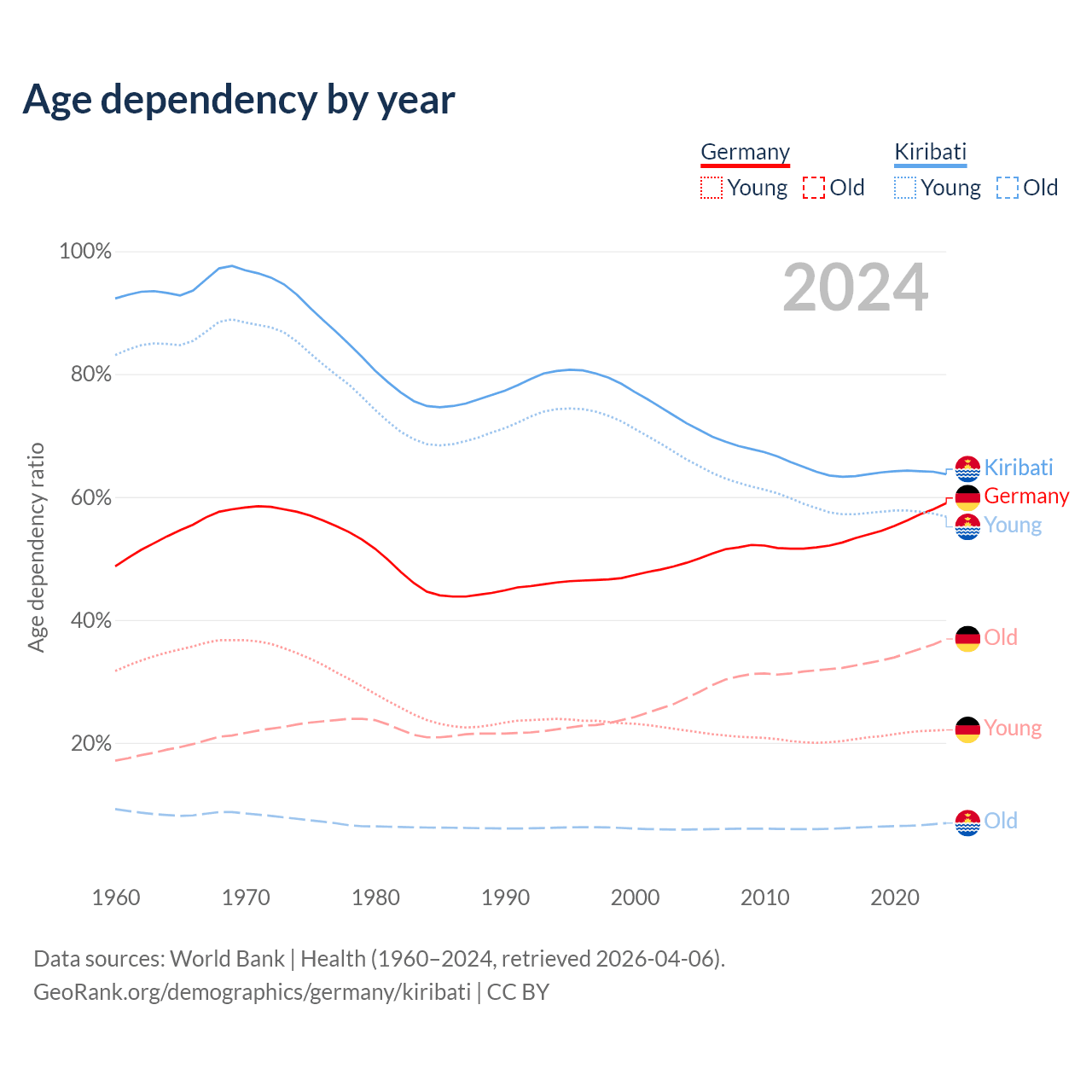 - Germany is ranked 9/196 by median age (oldest to youngest) vs 139/196 for Kiribati.