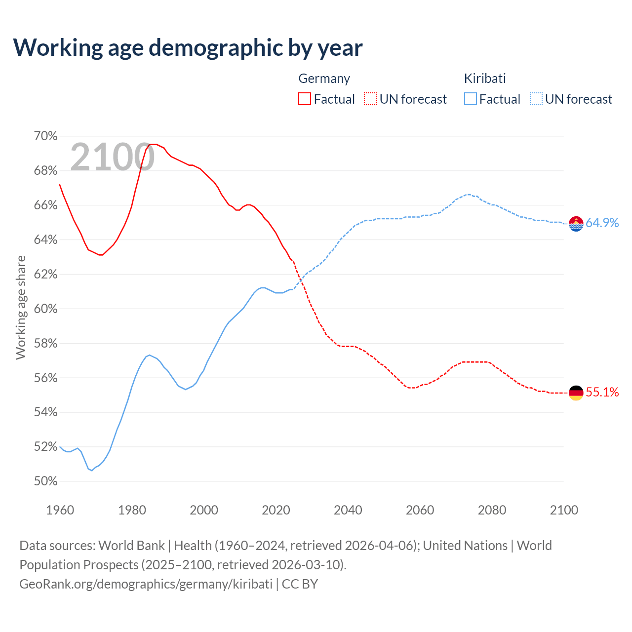 - Germany has 51.9M working age adults (aged 15-64) vs 84.9K in Kiribati.