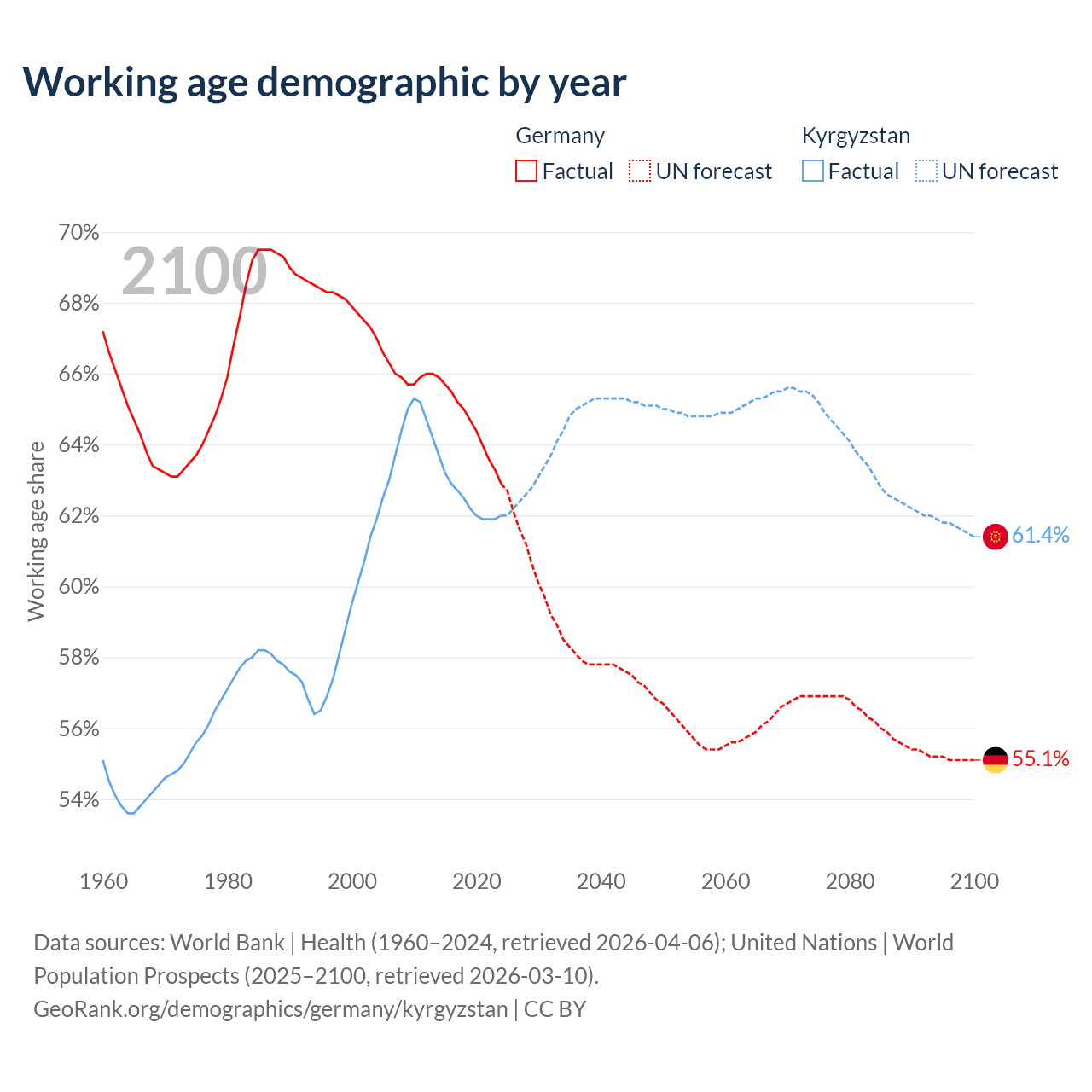 Median age Germany vs Kyrgyzstan, 1960-2100