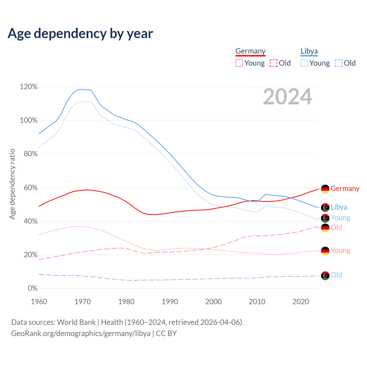 - Germany is ranked 9/196 by median age (oldest to youngest) vs 114/196 for Libya.