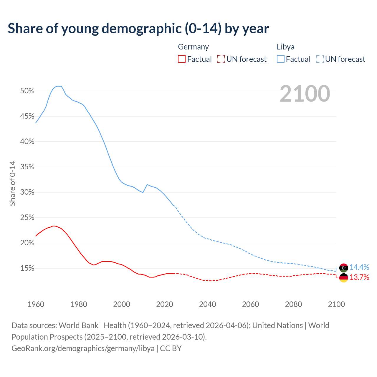 - The share of young demographic (0-15 years old) in Germany is 13.9% vs 27.4% in Libya.