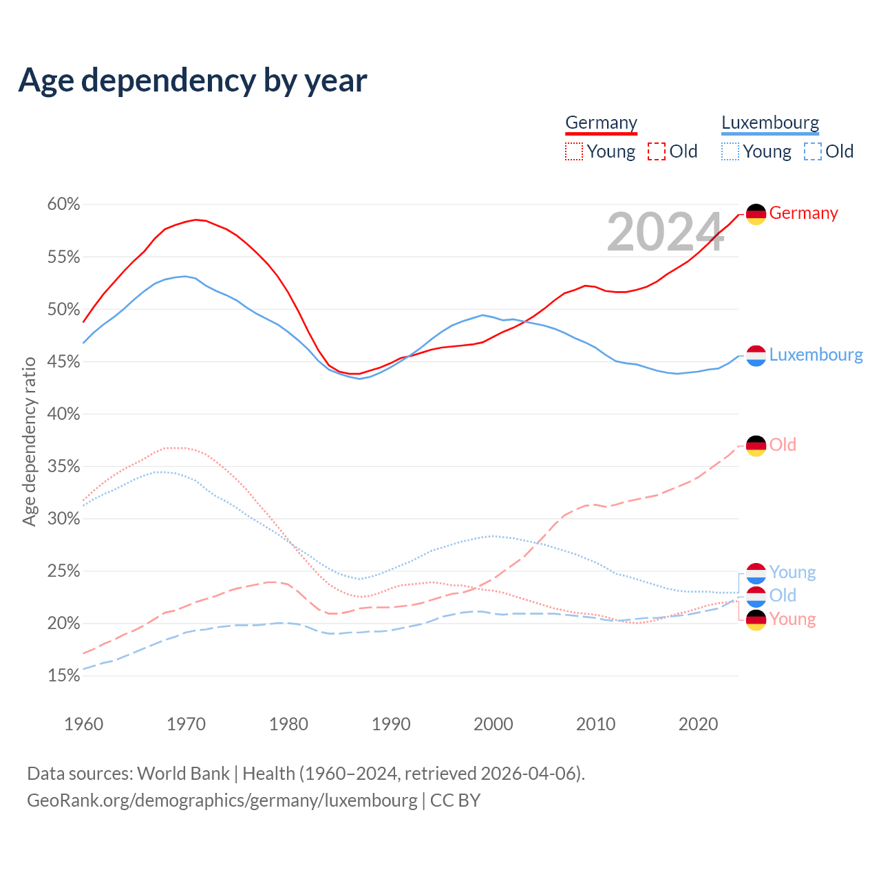 - Germany is ranked 9/196 by median age (oldest to youngest) vs 46/196 for Luxembourg.