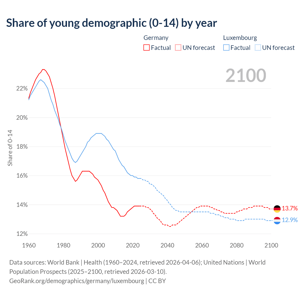 - The share of young demographic (0-15 years old) in Germany is 13.9% vs 15.8% in Luxembourg.