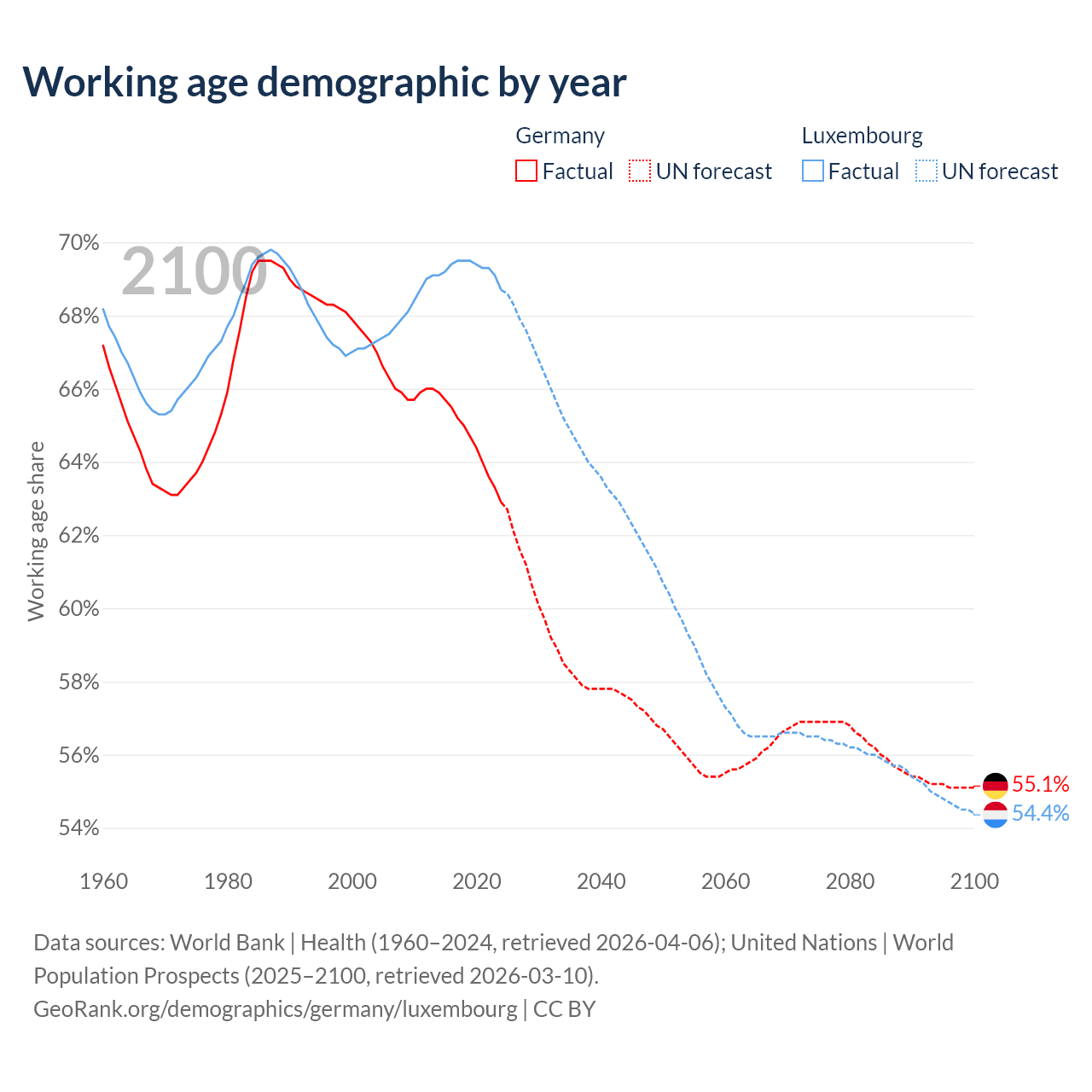 Median age Germany vs Luxembourg, 1960-2100