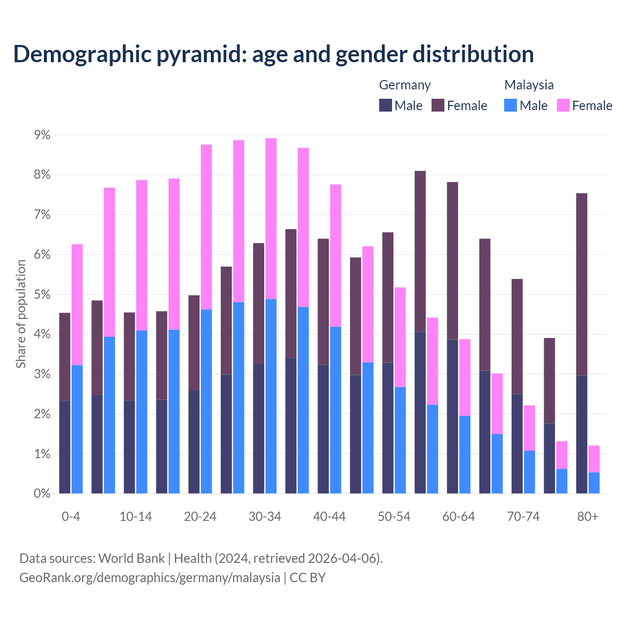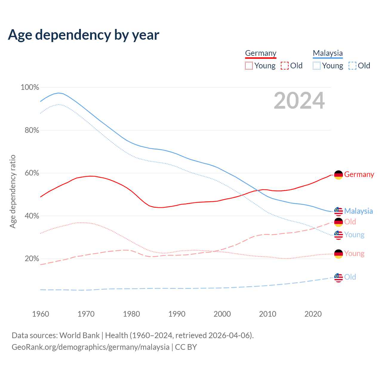 - Germany is ranked 9/196 by median age (oldest to youngest) vs 92/196 for Malaysia.