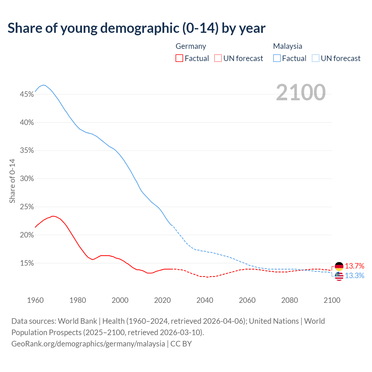 - The share of young demographic (0-15 years old) in Germany is 13.9% vs 21.8% in Malaysia.