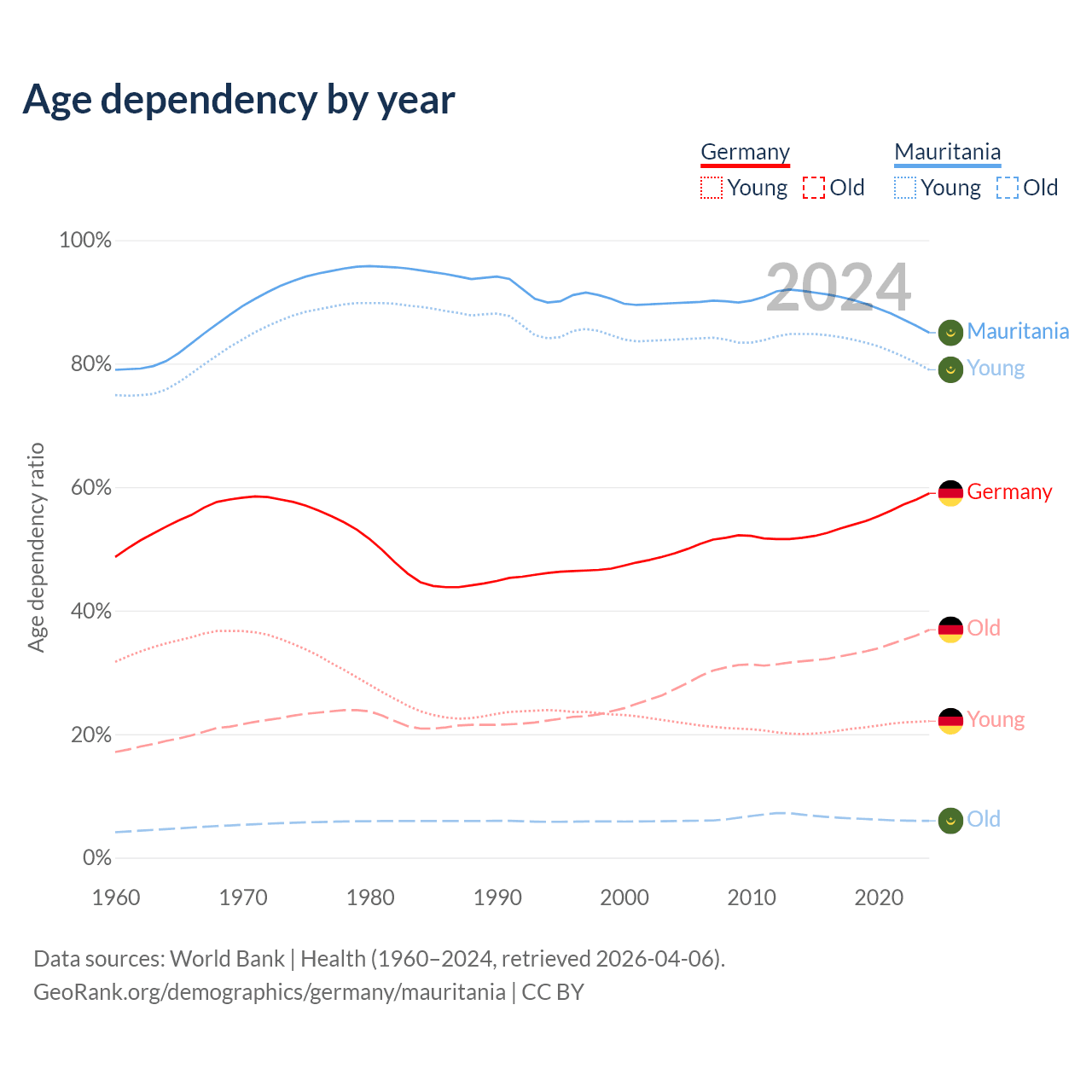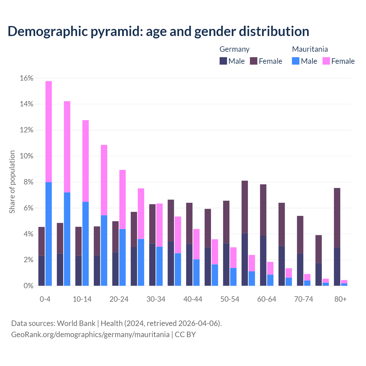 - As of 2026, the population of Germany is 82.6M vs 5.51M in Mauritania - 15 times difference.