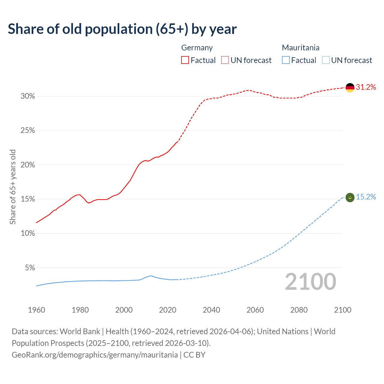 The share of older people aged 65 and over is 23.2% in Germany and 3.23% in Mauritania. Life expectancy in Germany compared to Mauritania .
