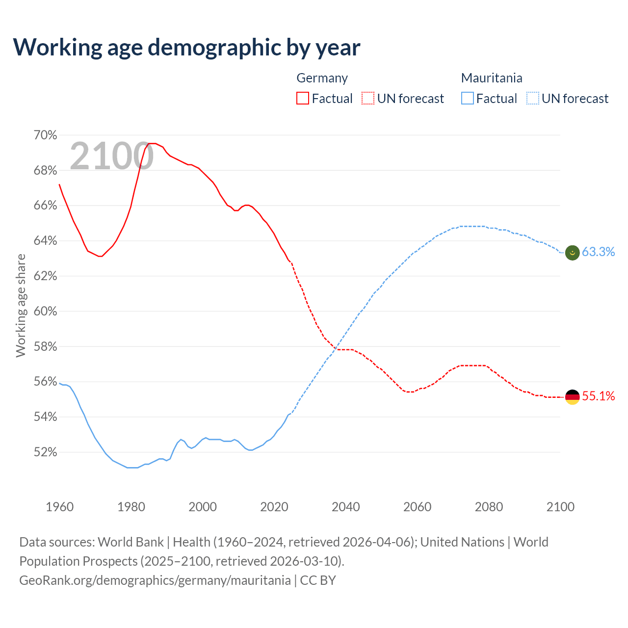 - Germany has 51.9M working age adults (aged 15-64) vs 2.98M in Mauritania.