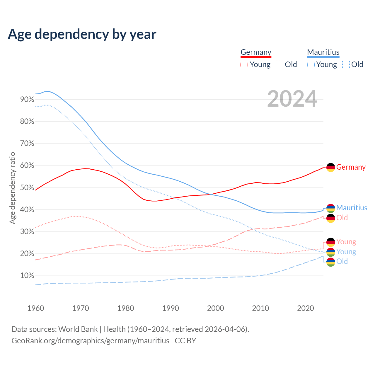 - Germany is ranked 9/196 by median age (oldest to youngest) vs 57/196 for Mauritius.