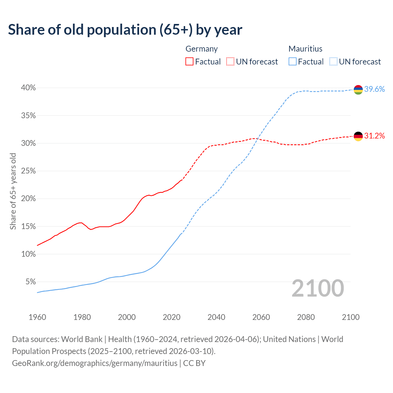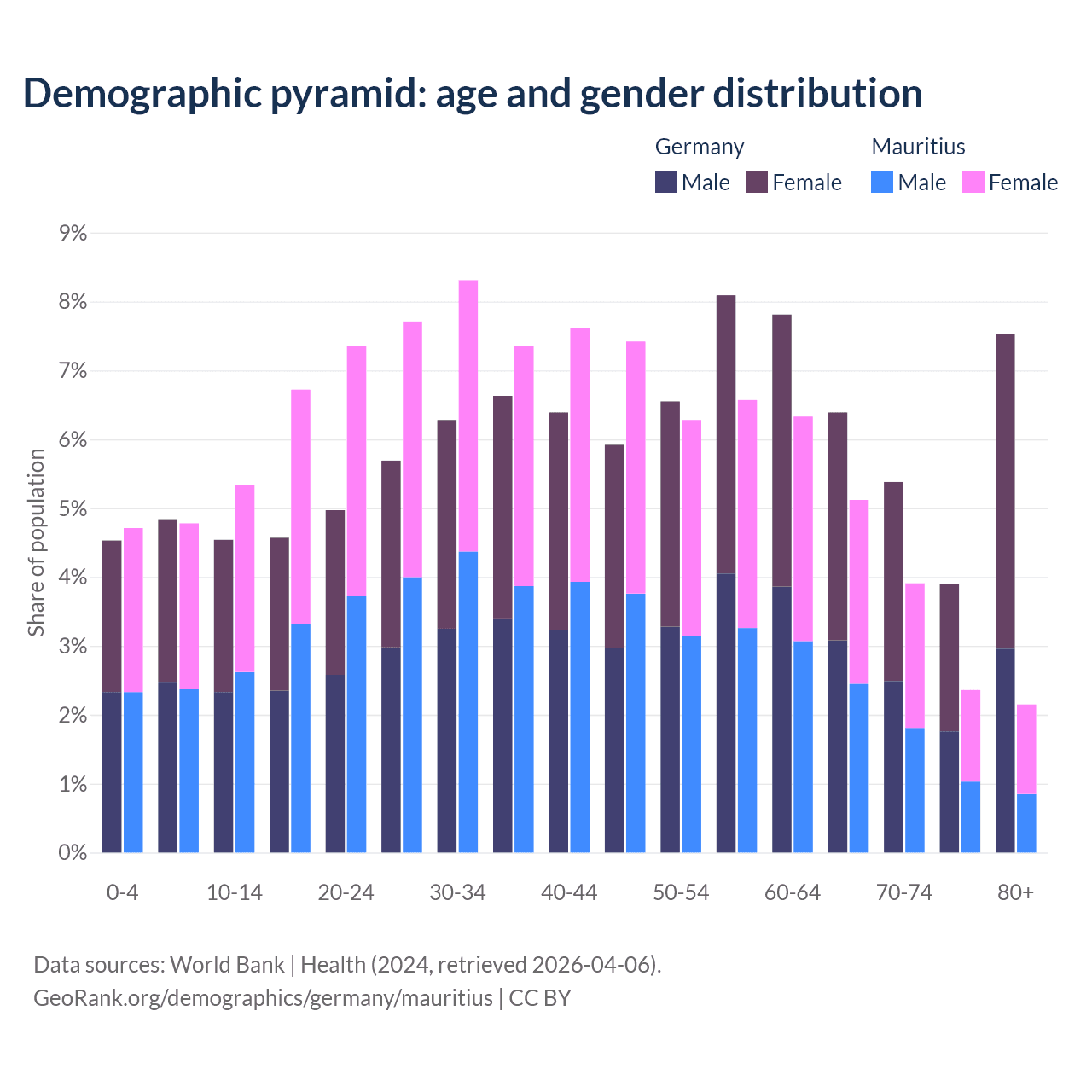 The share of older people aged 65 and over is 23.2% in Germany and 13.5% in Mauritius. Life expectancy in Germany compared to Mauritius .