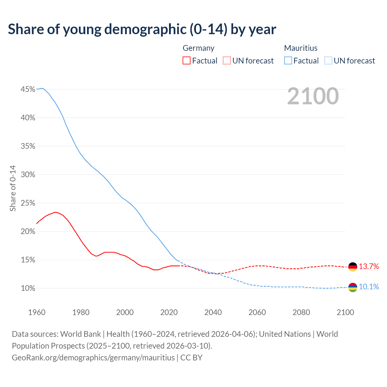 - The share of young demographic (0-15 years old) in Germany is 13.9% vs 14.8% in Mauritius.