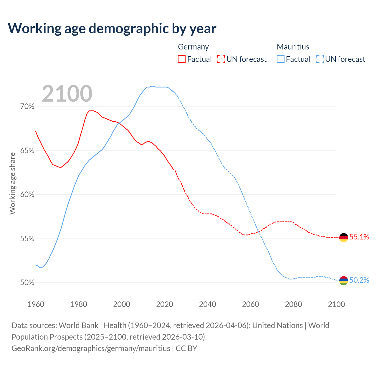 - Germany has 51.9M working age adults (aged 15-64) vs 889K in Mauritius.