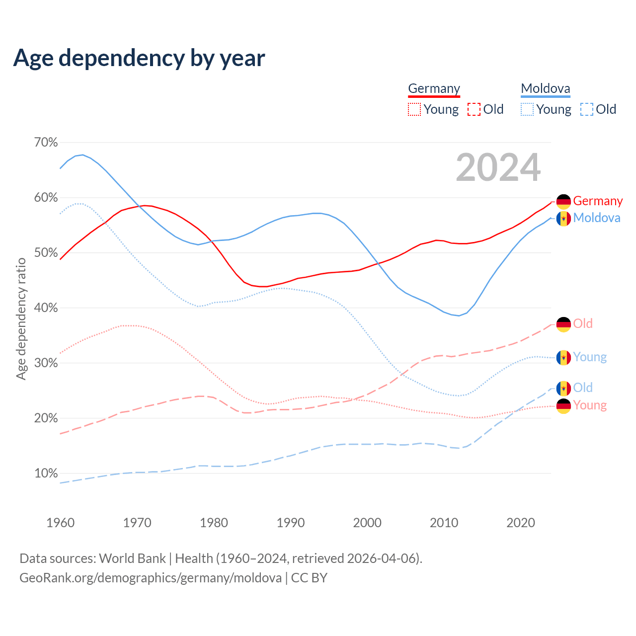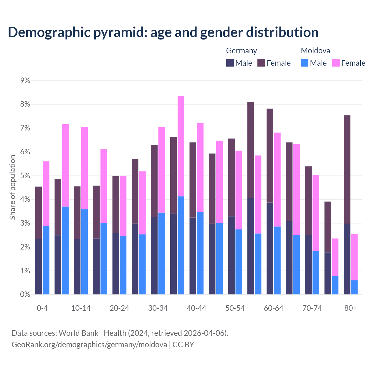 - Germany is ranked 9/196 by median age (oldest to youngest) vs 54/196 for Moldova.