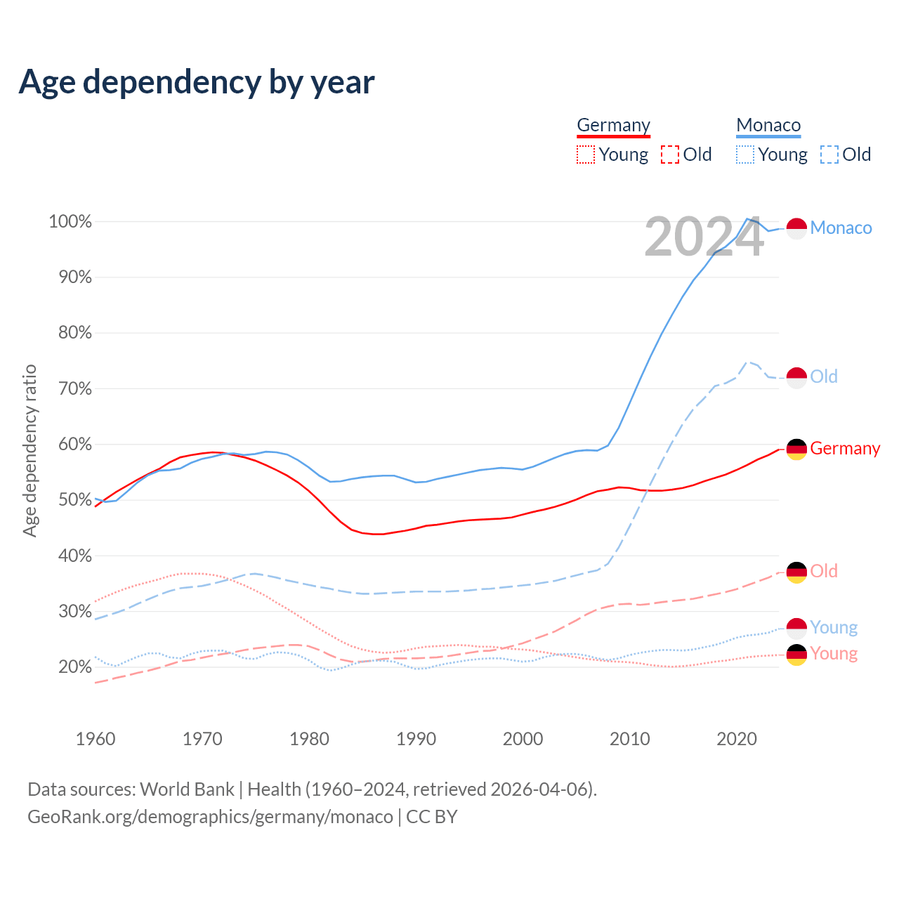- Germany is ranked 9/196 by median age (oldest to youngest) vs 1/196 for Monaco.