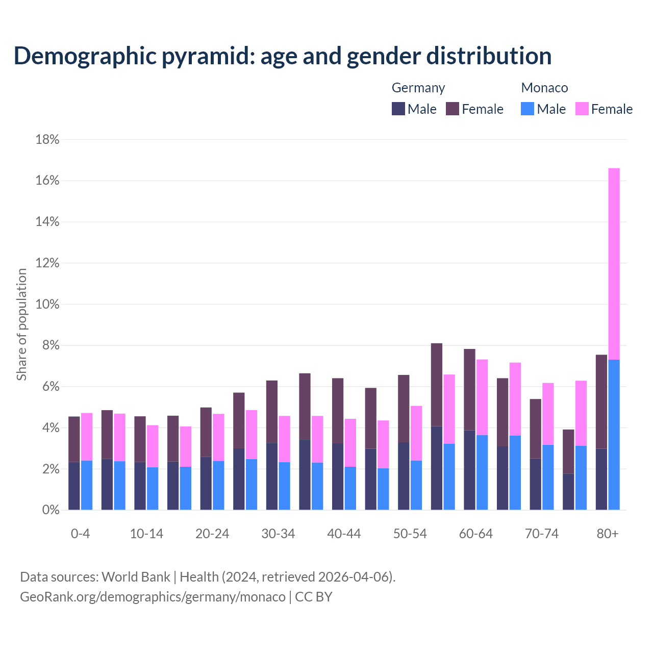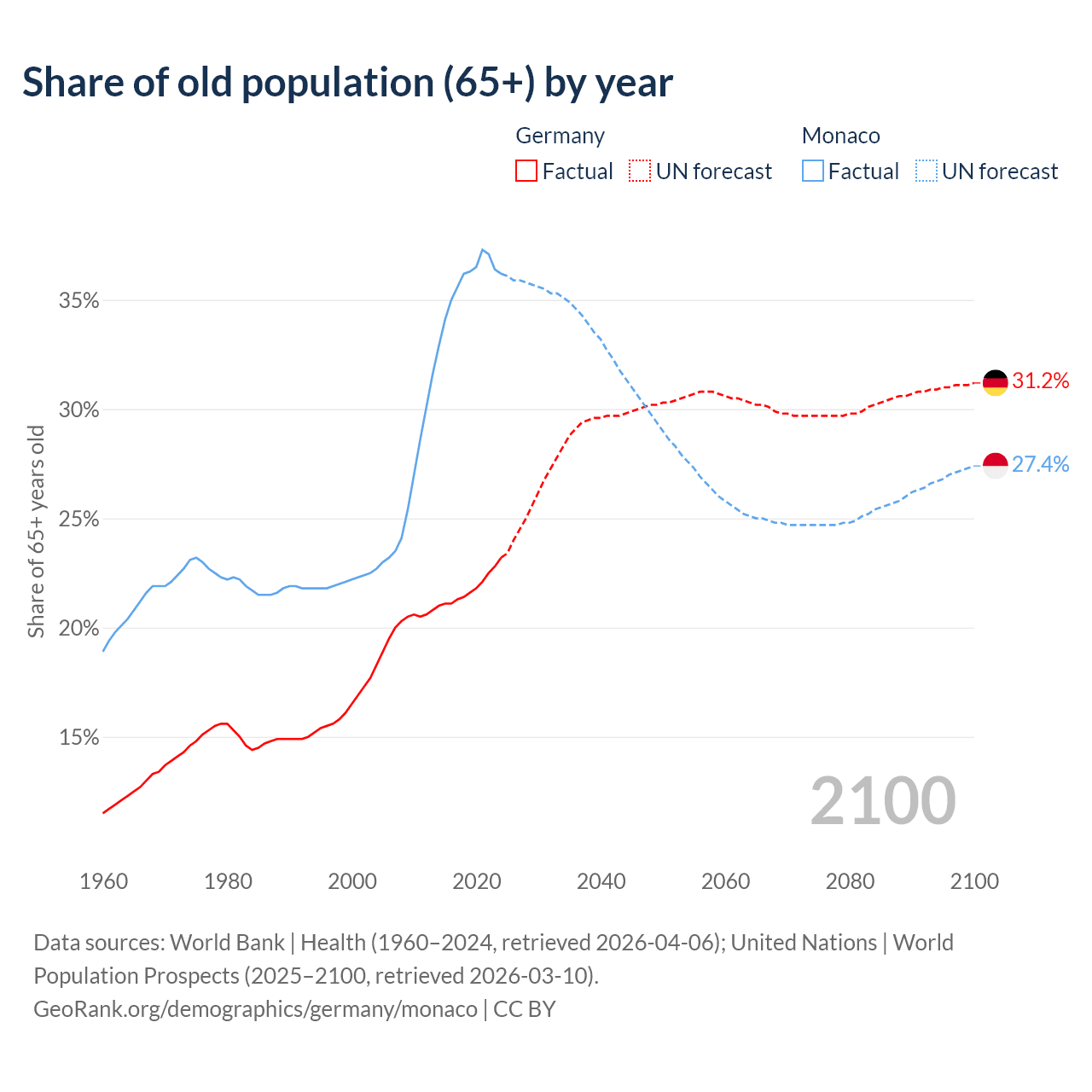 The share of older people aged 65 and over is 23.2% in Germany and 36.2% in Monaco. Life expectancy in Germany compared to Monaco .