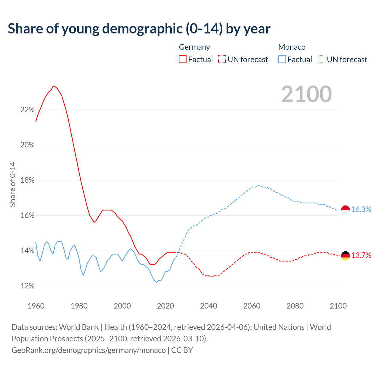 - The share of young demographic (0-15 years old) in Germany is 13.9% vs 13.5% in Monaco.