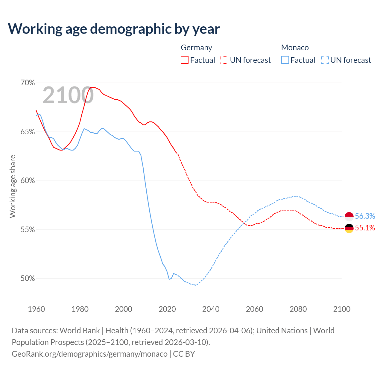 Median age Germany vs Monaco, 1960-2100