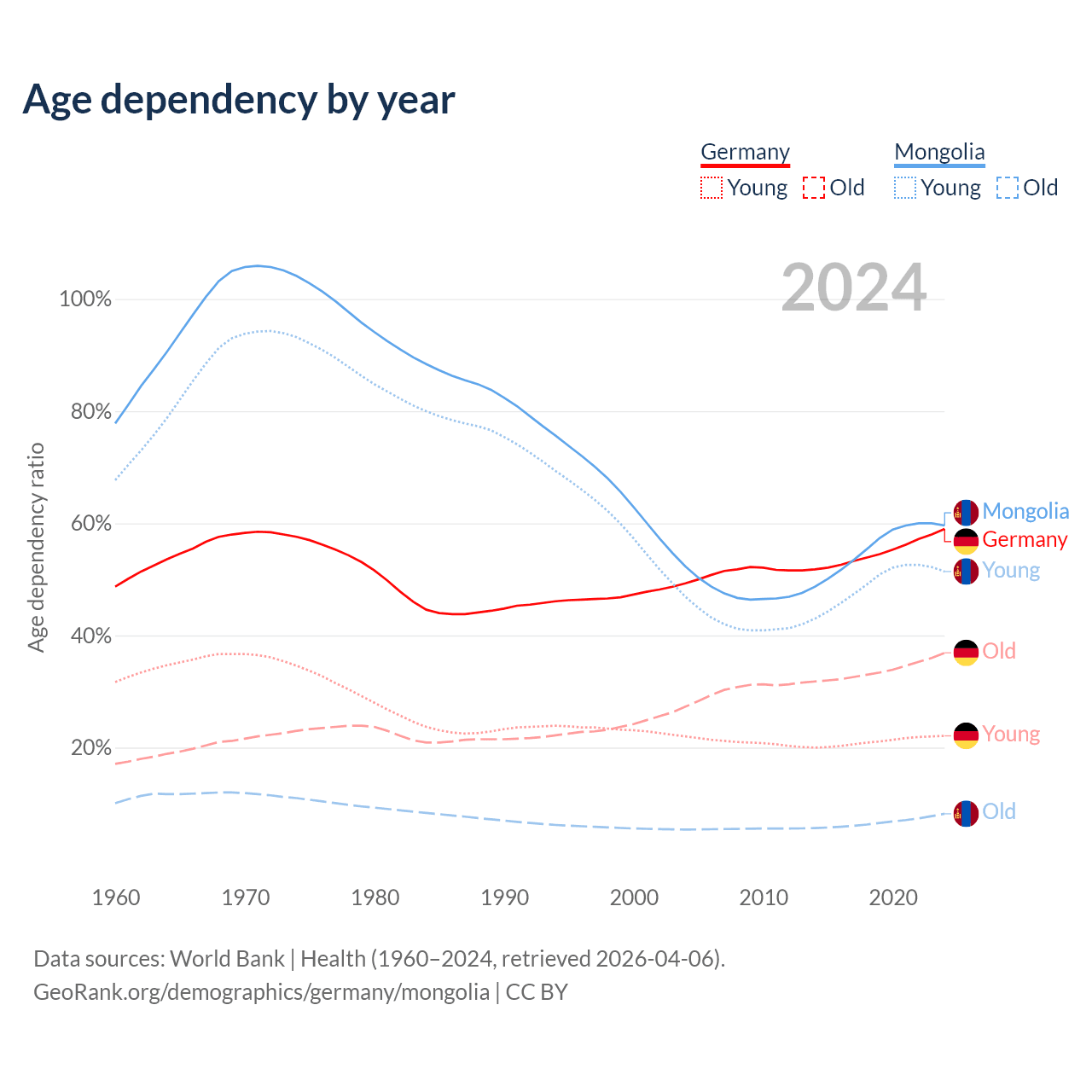 - Germany is ranked 9/196 by median age (oldest to youngest) vs 117/196 for Mongolia.