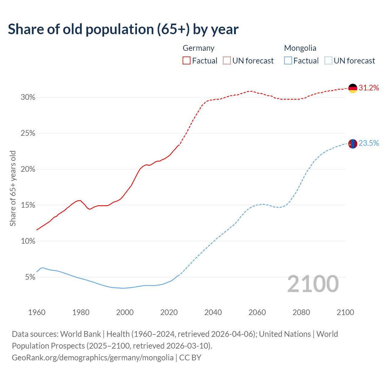 The share of older people aged 65 and over is 23.2% in Germany and 5.14% in Mongolia. Life expectancy in Germany compared to Mongolia .