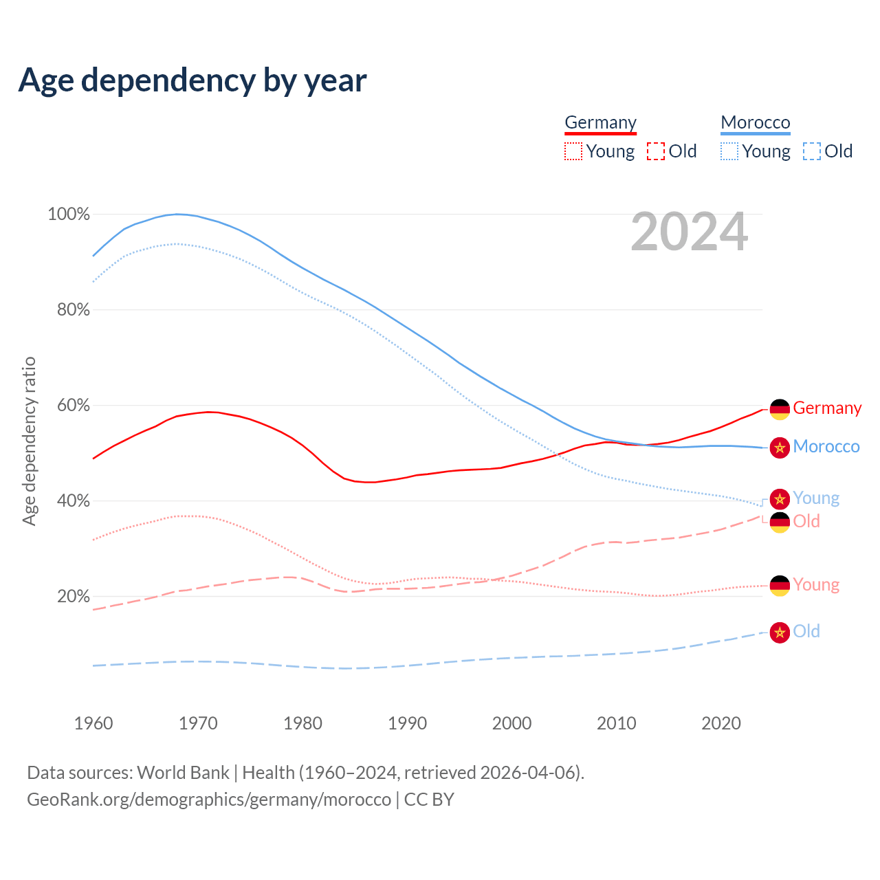 - Germany is ranked 9/196 by median age (oldest to youngest) vs 100/196 for Morocco.