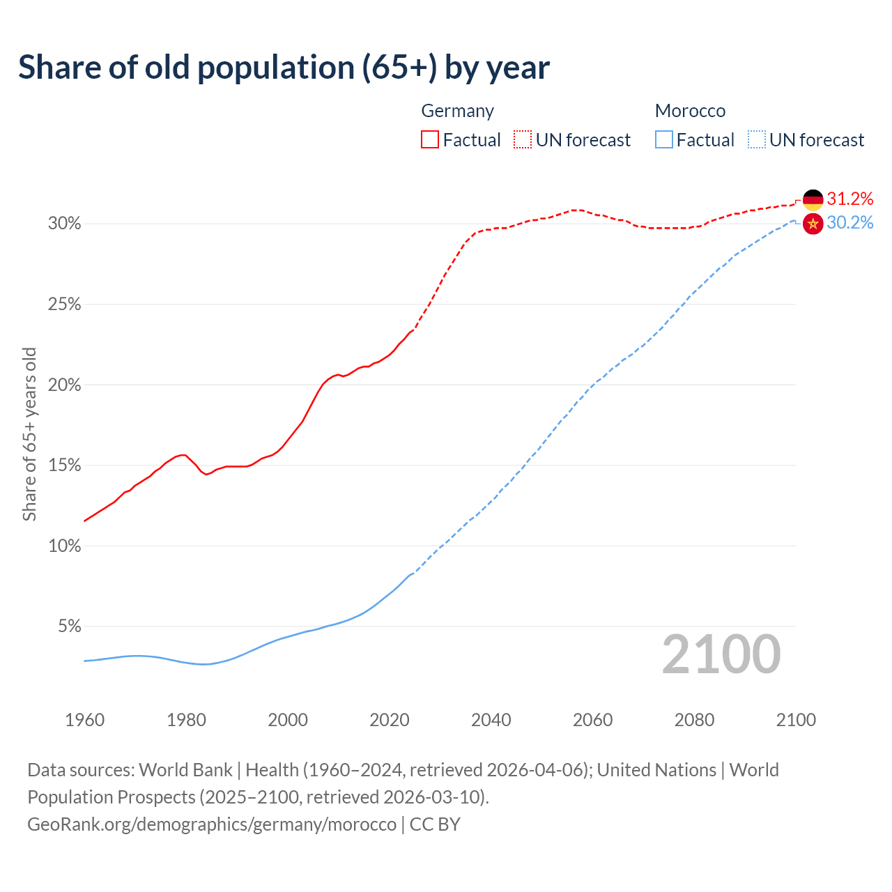The share of older people aged 65 and over is 23.2% in Germany and 8.14% in Morocco. Life expectancy in Germany compared to Morocco .