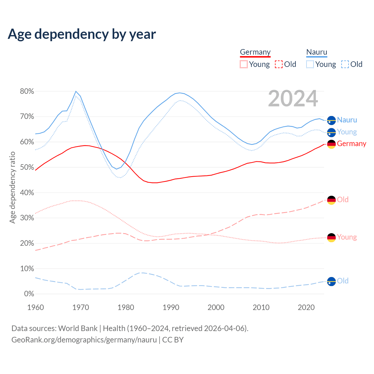 - Germany is ranked 9/196 by median age (oldest to youngest) vs 155/196 for Nauru.