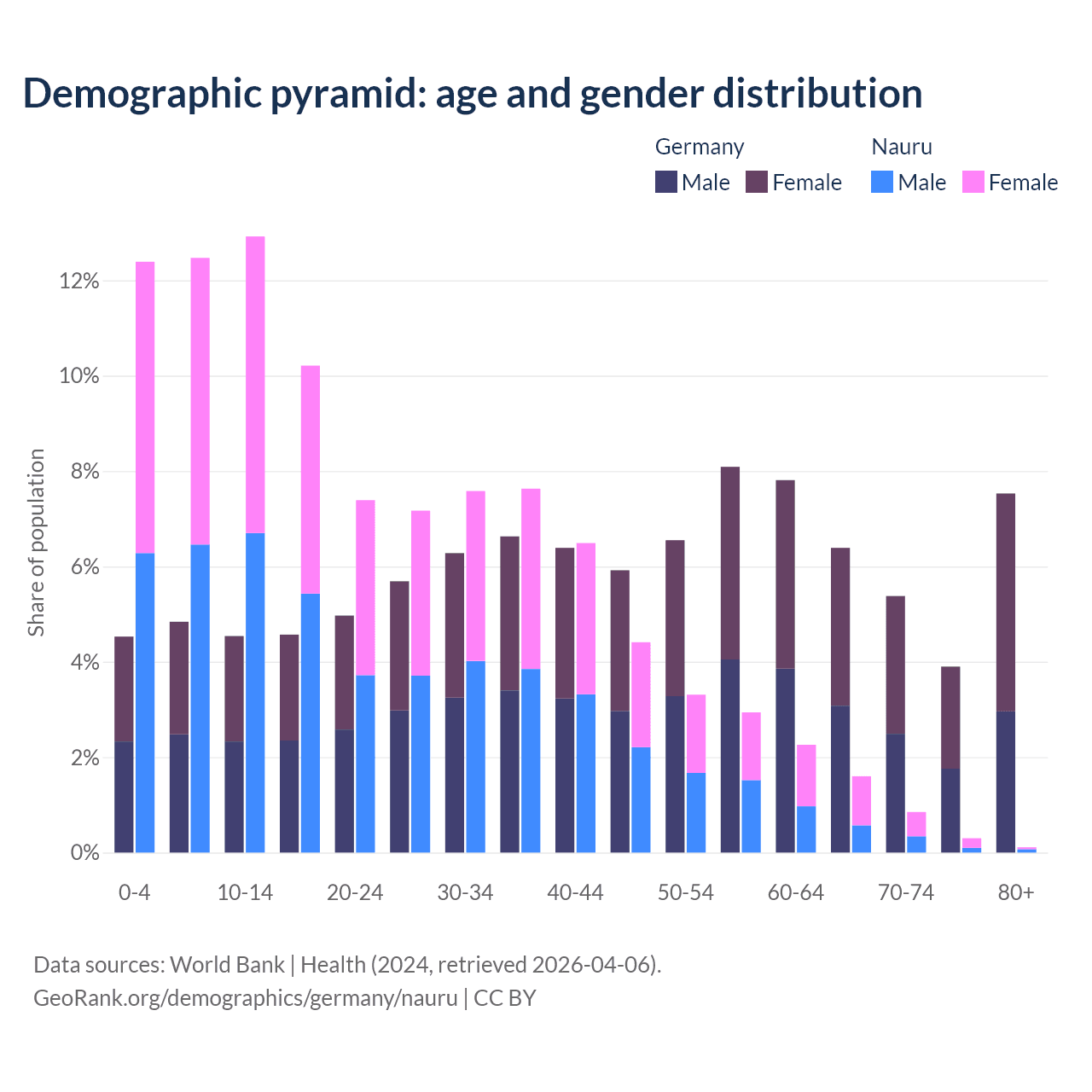 - As of 2026, the population of Germany is 82.6M vs 12.1K in Nauru - 6,810 times difference.